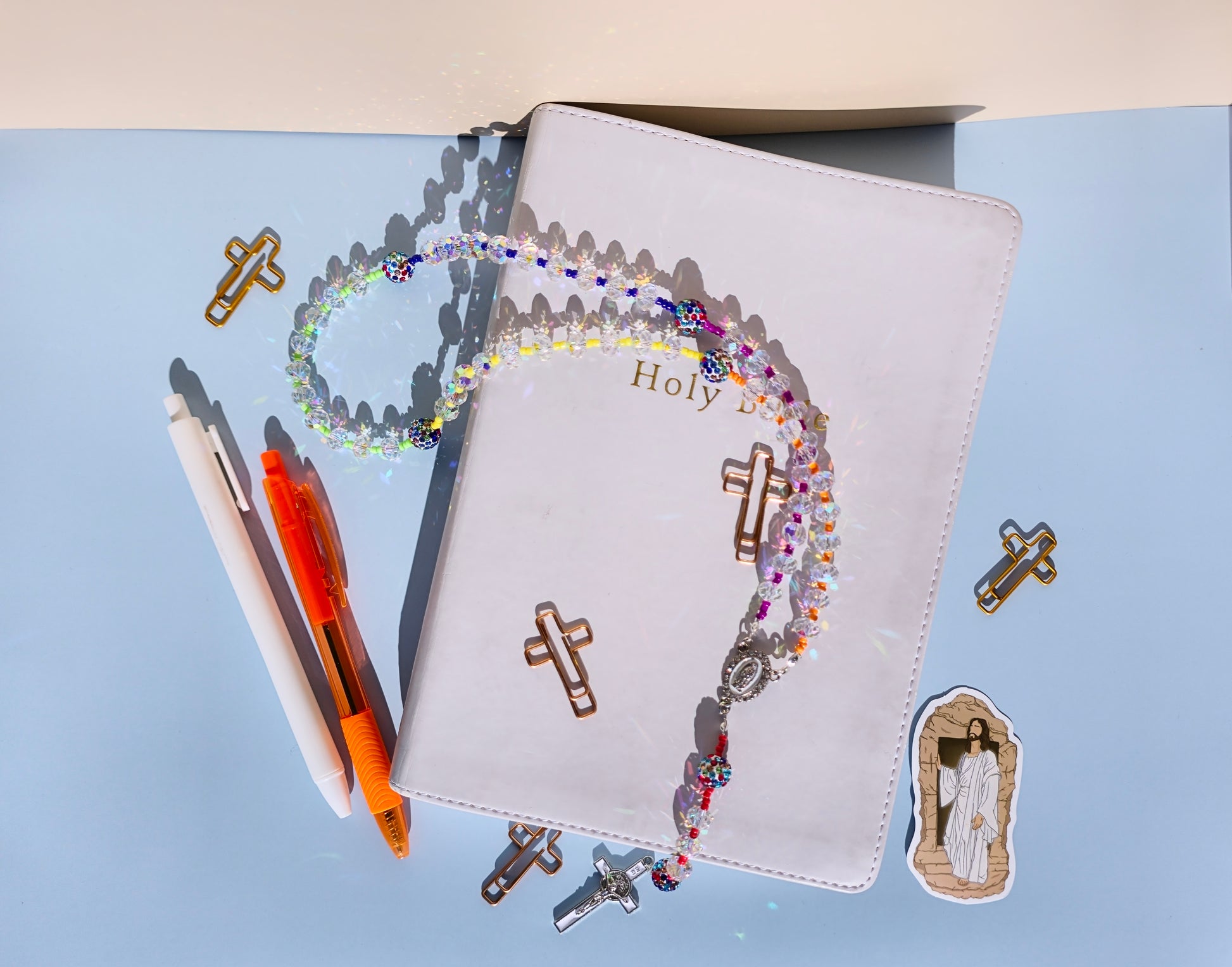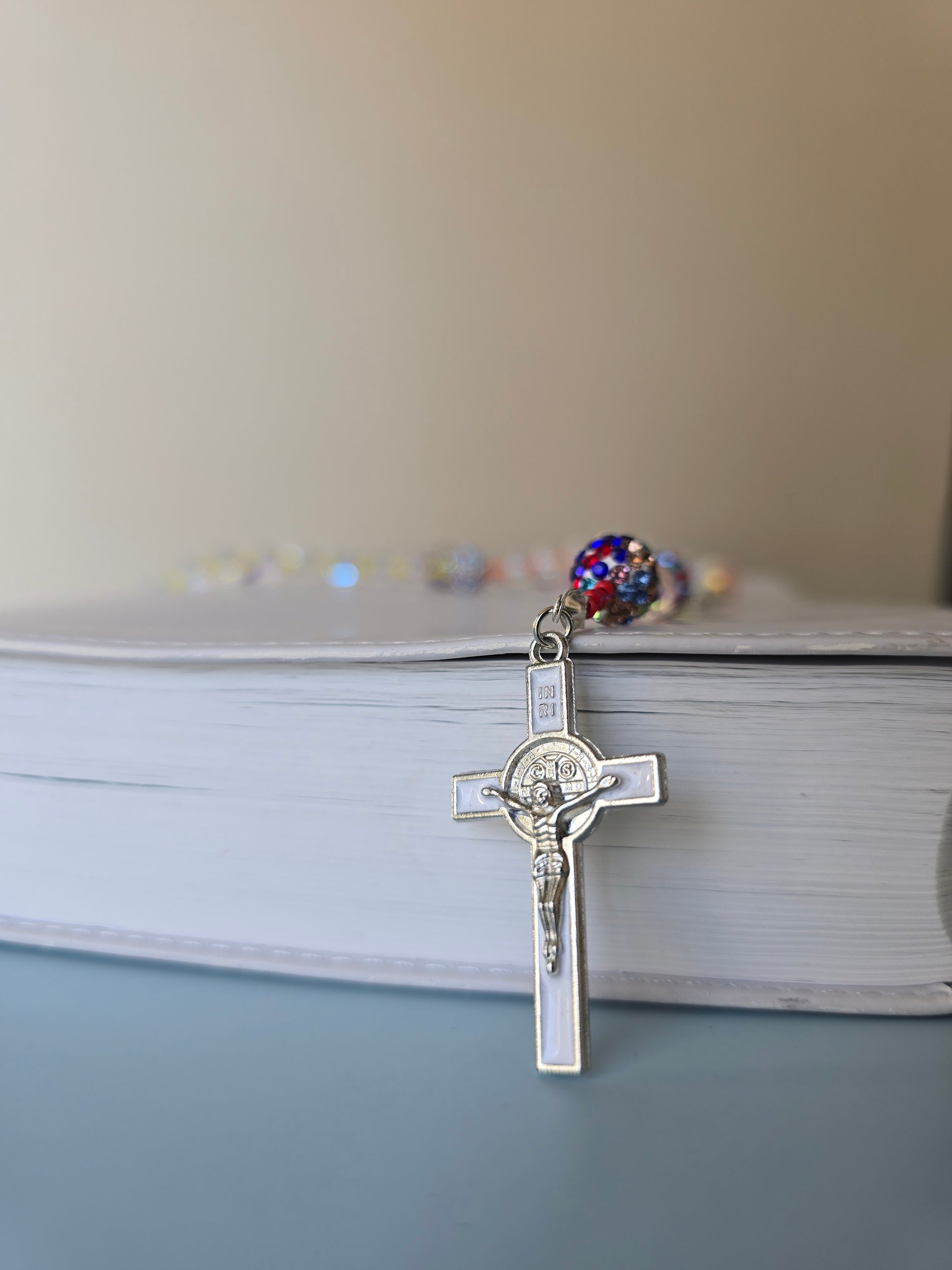My son designed this to appear like the Rainbow God made to Noah after the flood. He wanted the clear glass beads to show Noah's purity. We use beading wire and beautiful glass beads. Our rosaries are beautiful and long lasting.